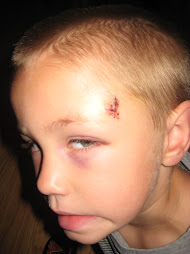 Thursday evening Nic walked up behind his best buddy right about the time he was going to hit a golf ball and took a swing to the head. Yes, there were five adults standing right there, we just can't explain how we let that happen. Jeff made it to Nic first, scooped him up and off to the ER we went. Nic had a laceration to the left side of his forehead.